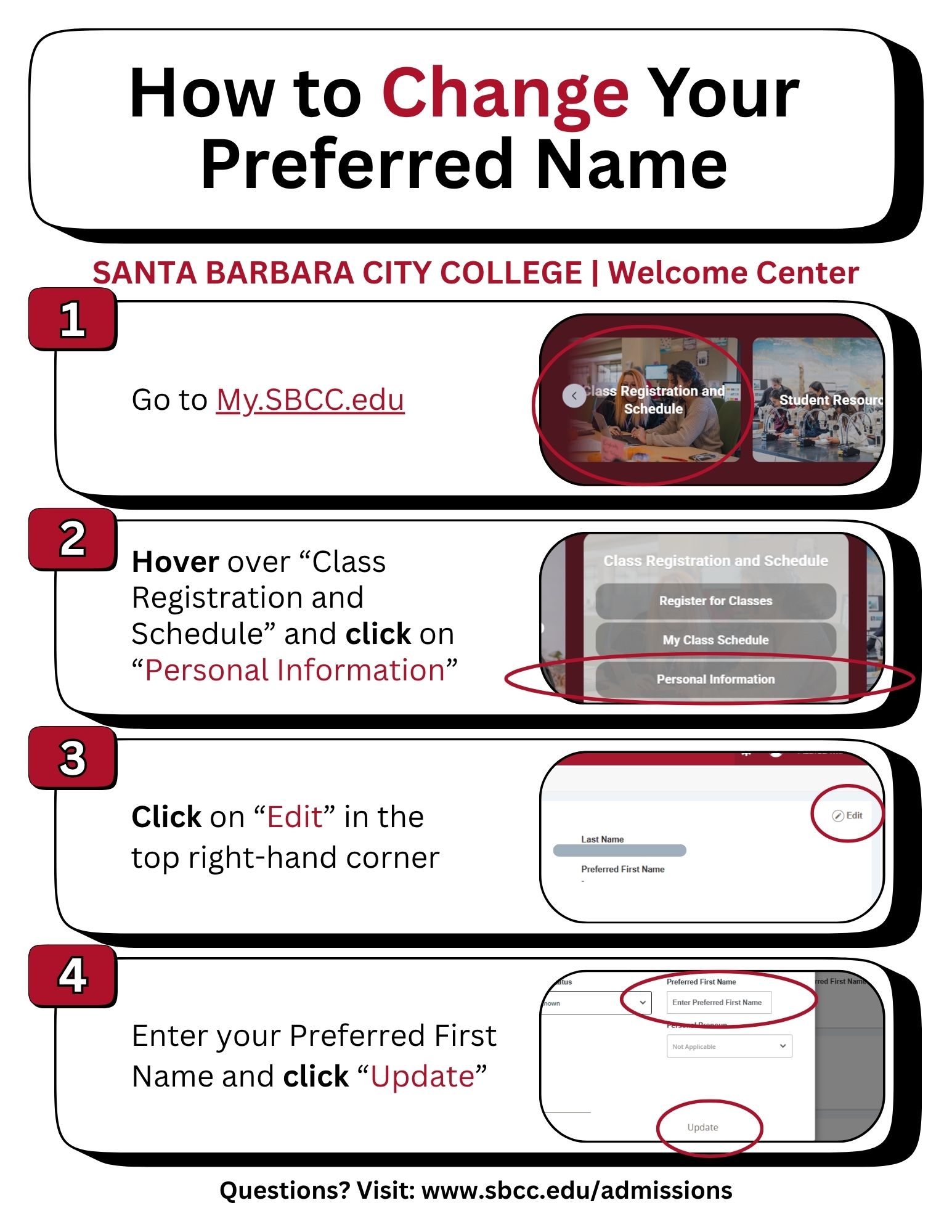 Santa Barbara City College (SBCC) acknowledges that many students and employees use preferred first names rather than legal first names to identify themselves. SBCC students now have the ability to designate a preferred name. Follow these steps to update your preferred name.